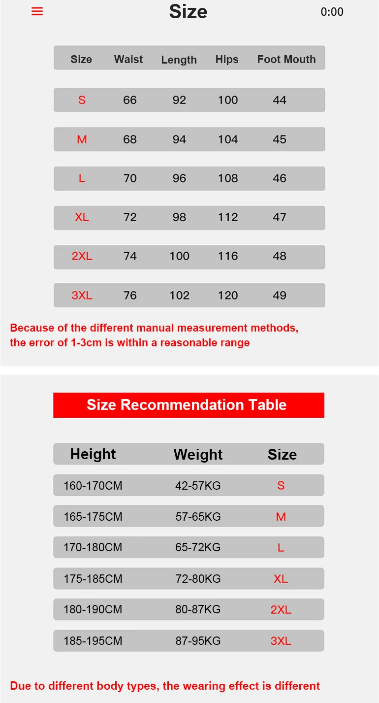 S 160-170 42-57KG, M 165-175 57-65KG, L 170-180 65-72KG, XL 175-185 72-80KG, 2XL 180-190 80-87KG, 3XL 185-195 87-95KG